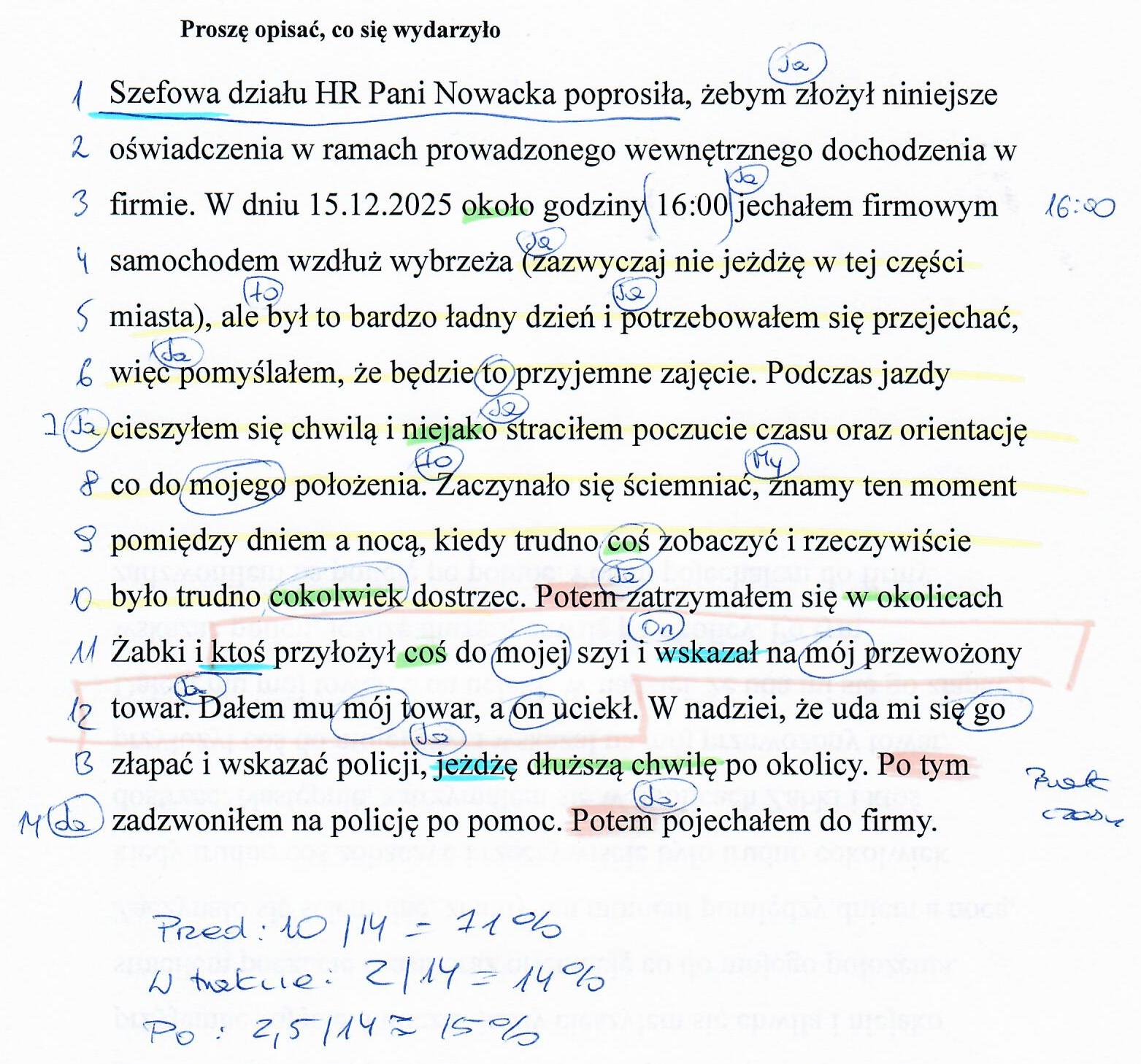 Jak widzisz, tekst został oznaczony różnymi kolorami. Kodowanie kolorami wywodzi się z Wydziału Analiz Behawioralnych FBI i ma służyć szybszemu zauważaniu schematów językowych w zeznaniach. Więcej na ten temat mówimy w trakcie Akademii czy na kursie z Analizy Wypowiedzi.